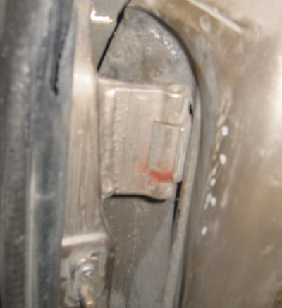 Для зручнішого монтажу були зняті задні двері, переднє крило. Через те, що якійсь рукожоп майстер з низькою кваліфікацією "заколхозив" штифти завіс, передні двері вирішили не знімати. Так як для їх демонтажу прийшлось би добряче пововтузитись, а монтажу порога вони не сильно заважали. До речі, хто не знає, в старих автомобілях Opel завіси дверей нерегулюємі. Одна частина завіса приварена до стійки кузова, інша до дверей, між ними спеціальний штифт. Ось так це виглядає: